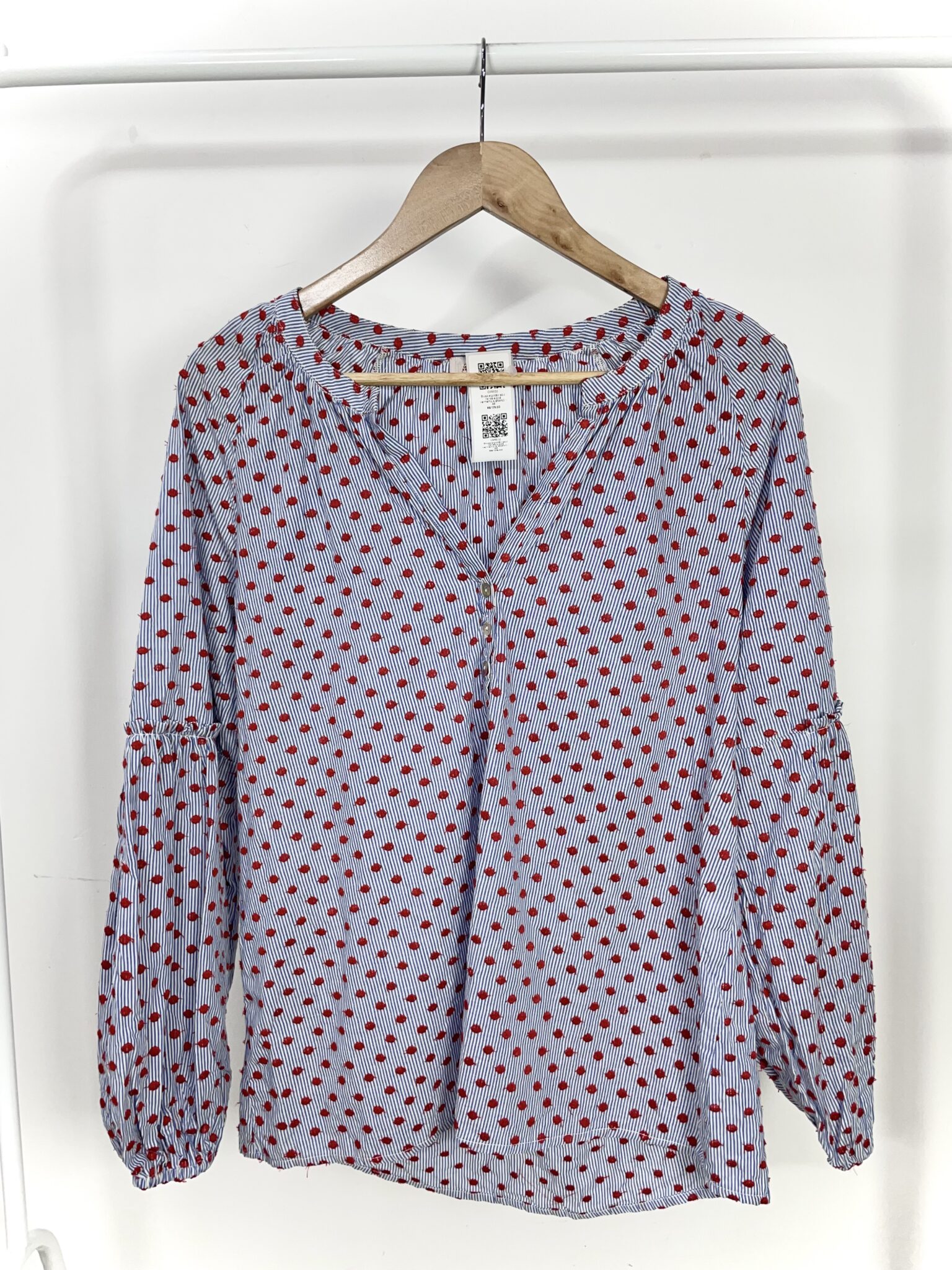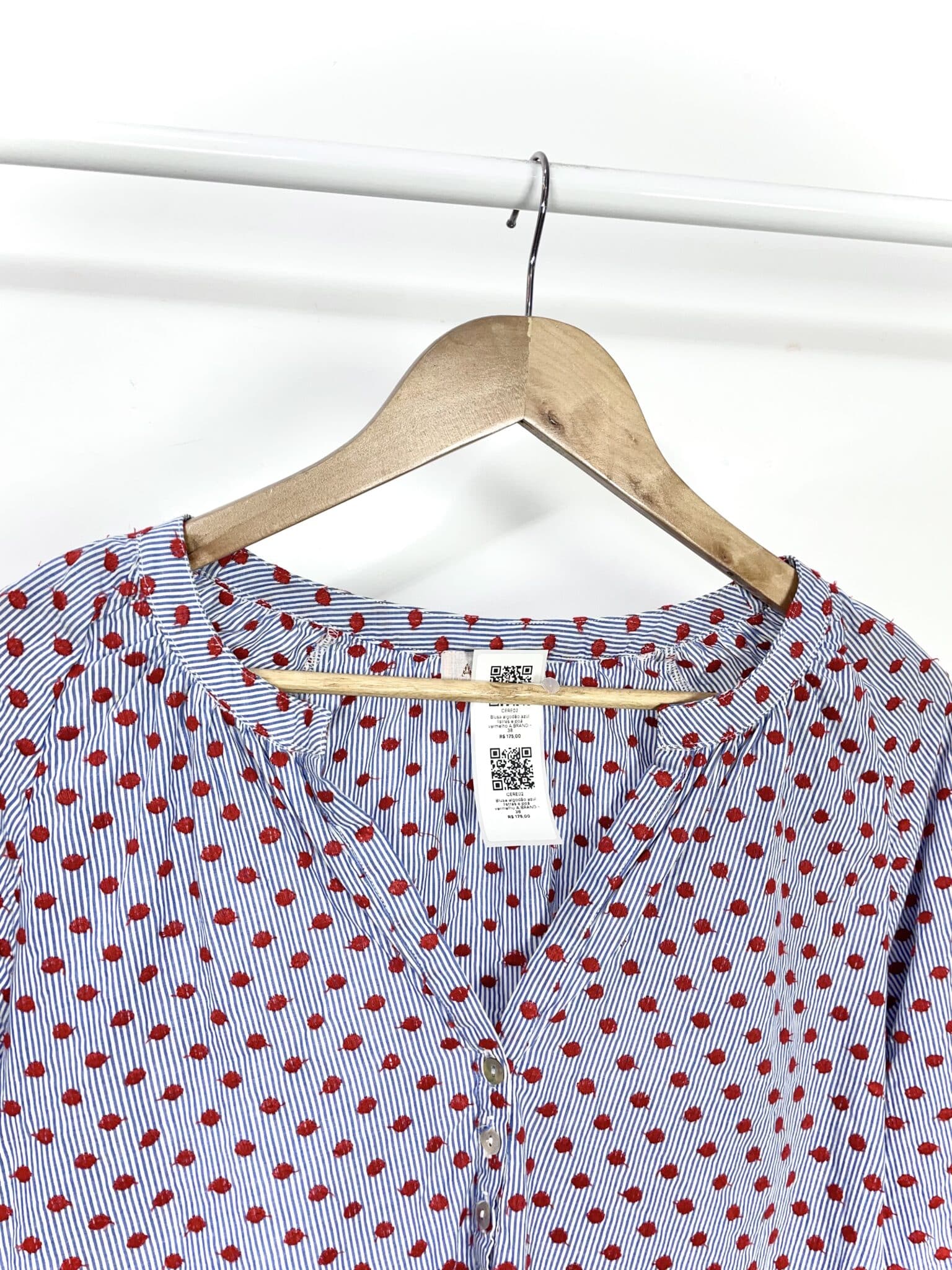 Blusa algodão azul listras e poá vermelho A.BRAND – 38 – VENDIDO SISTEMA OTO