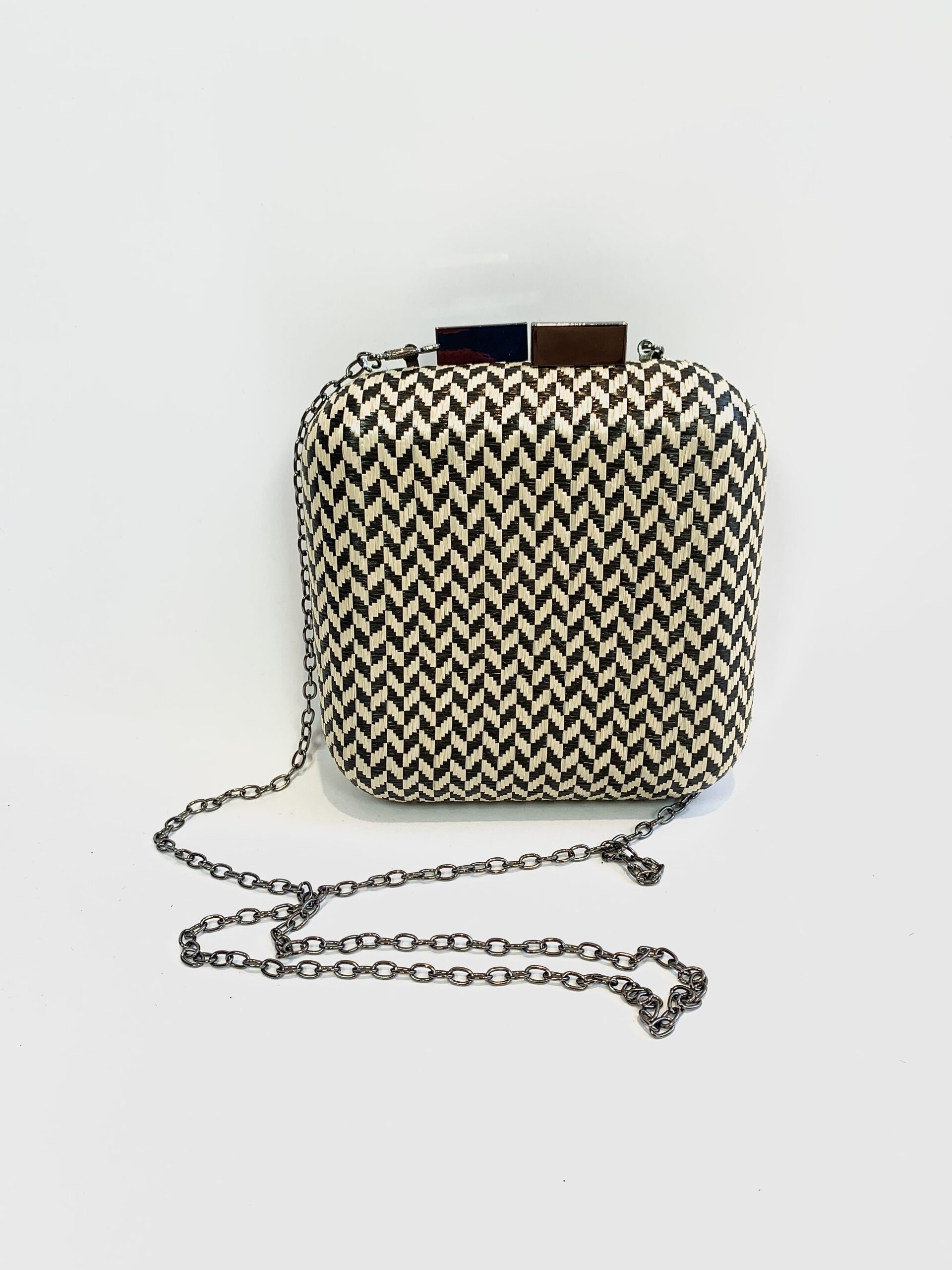 Bolsa pequena estampada preto e bege alça corrente