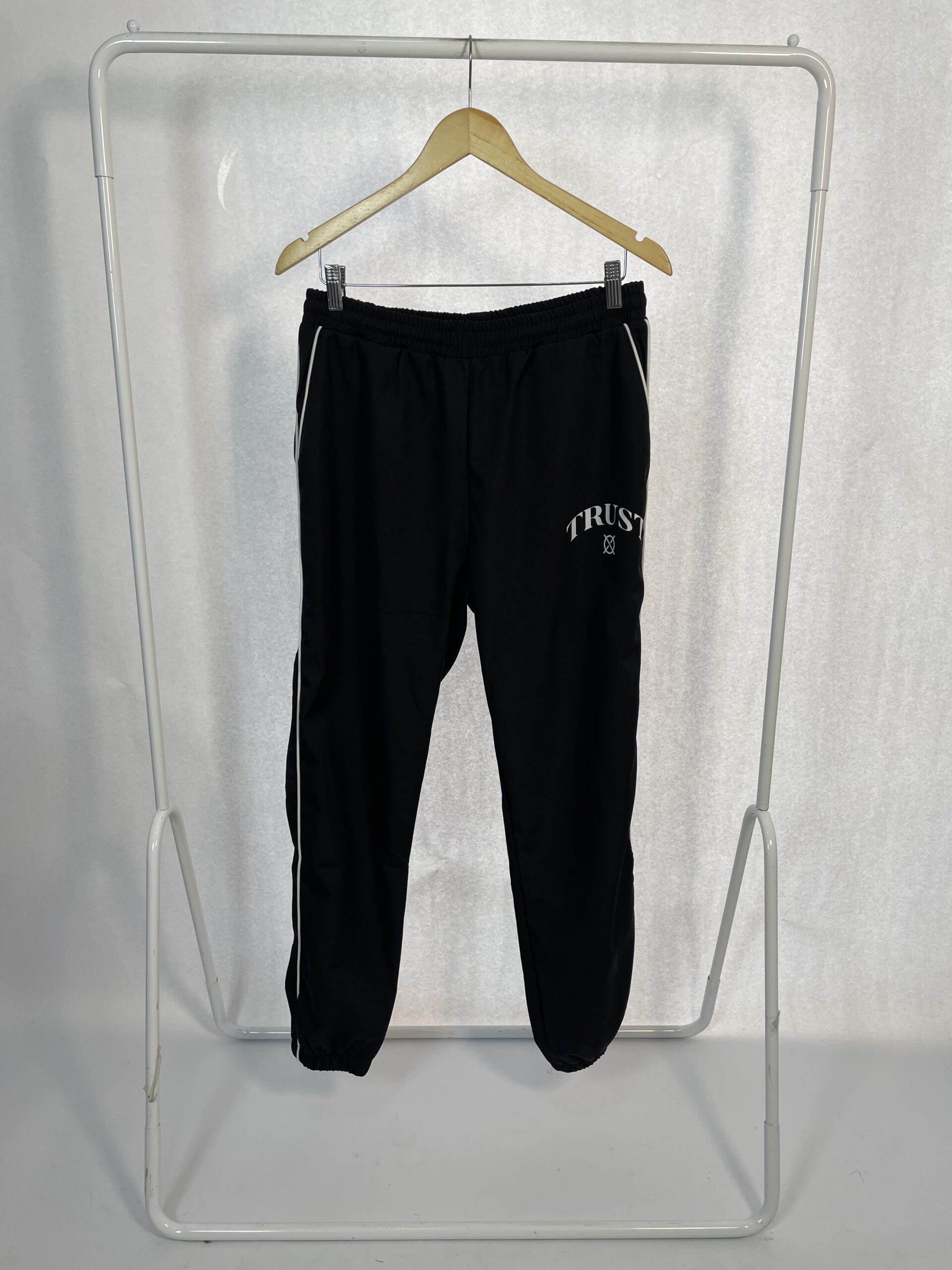Calça preta Com laterais Branca e logo estampado na perna CRUST – P