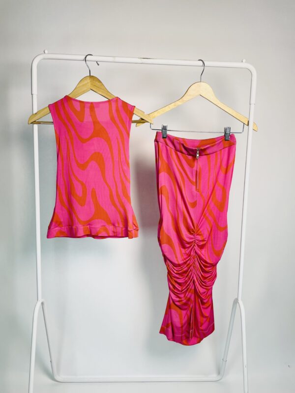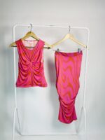 Conjunto saia e blusa malha fria rosa com vermelho NK – P – VENDIDO SISTEMA OTO