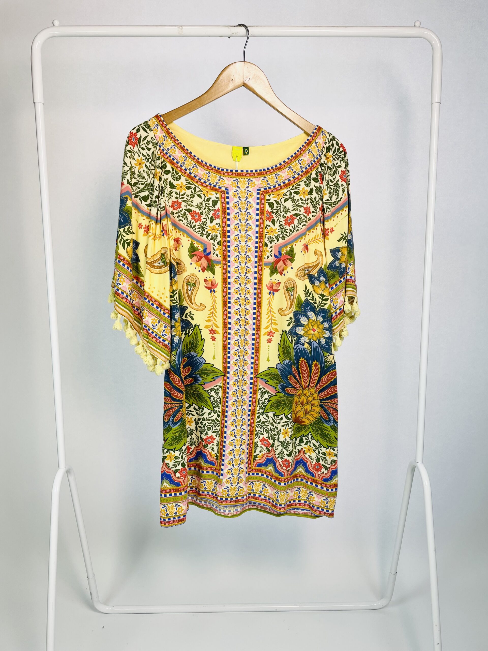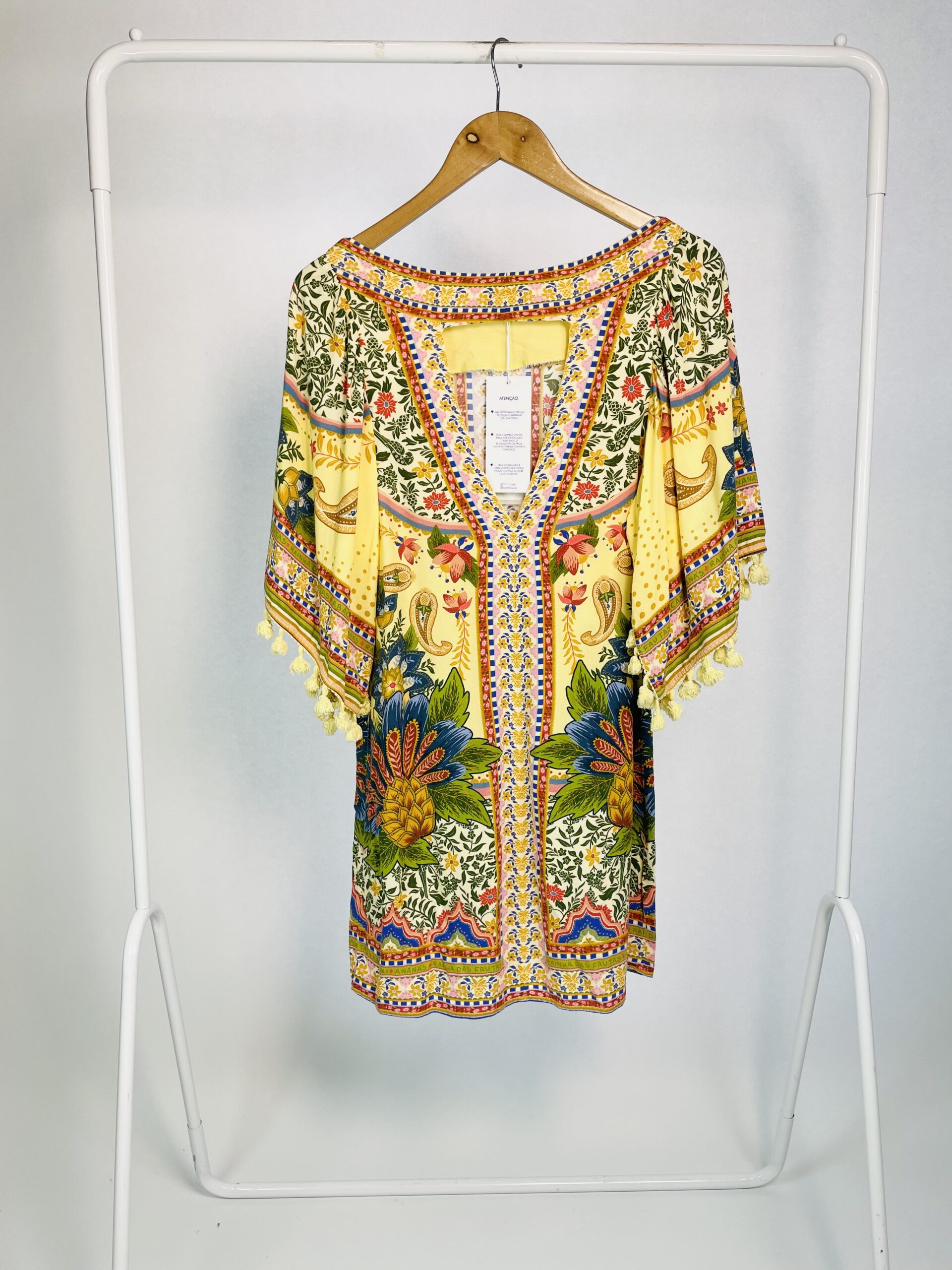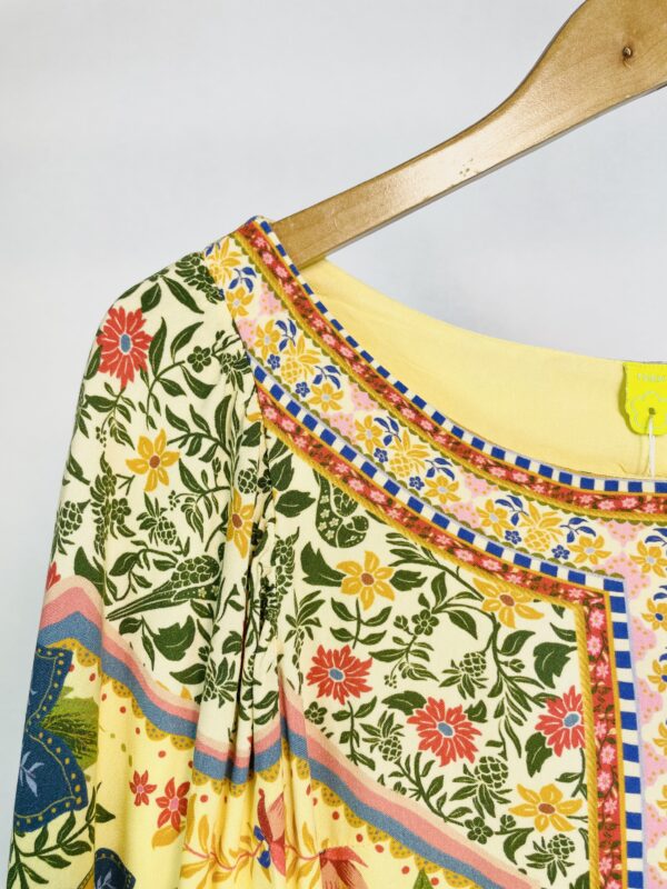 Vestido curto amarelo estampado com detalhes de barbicachos nas mangas FARM – PP