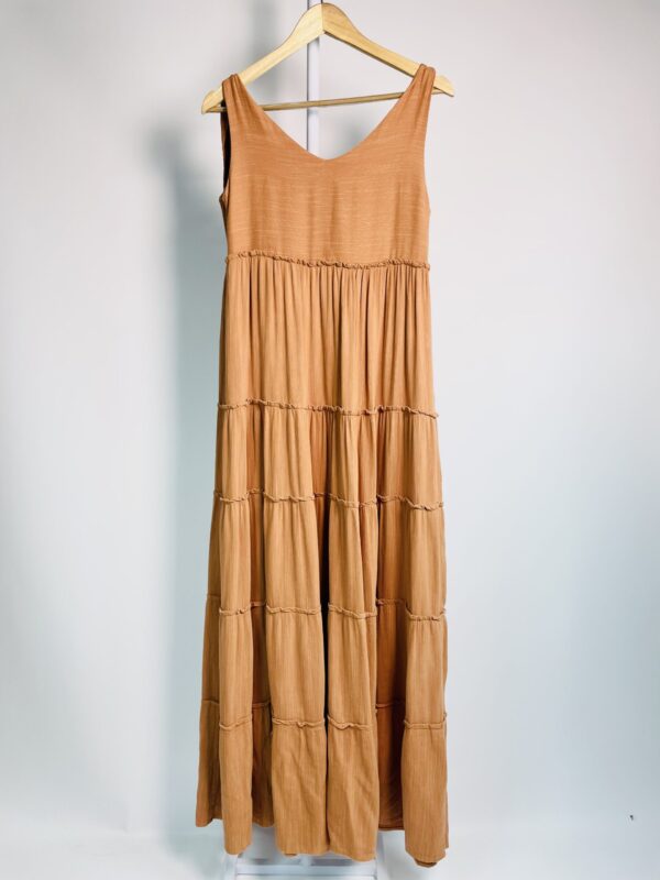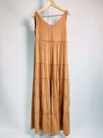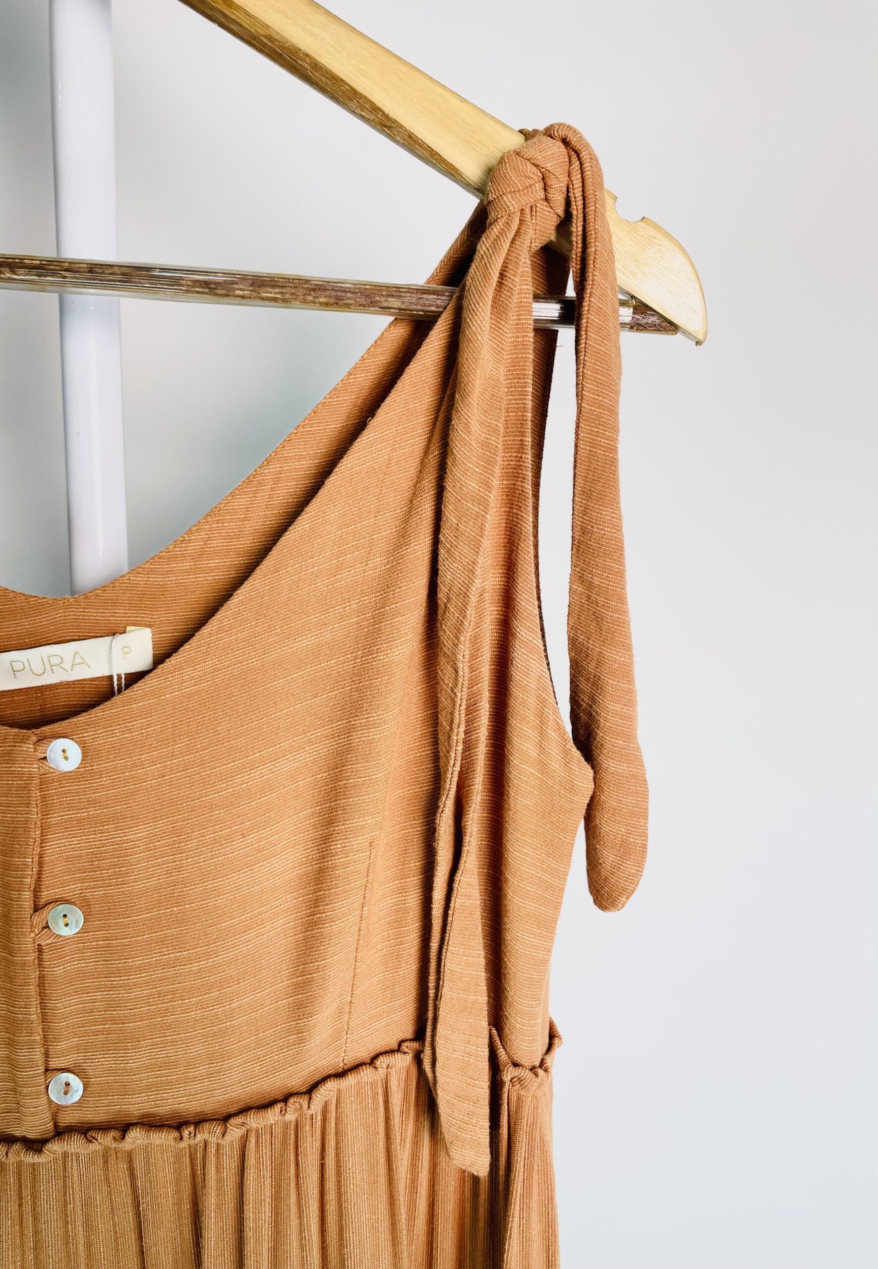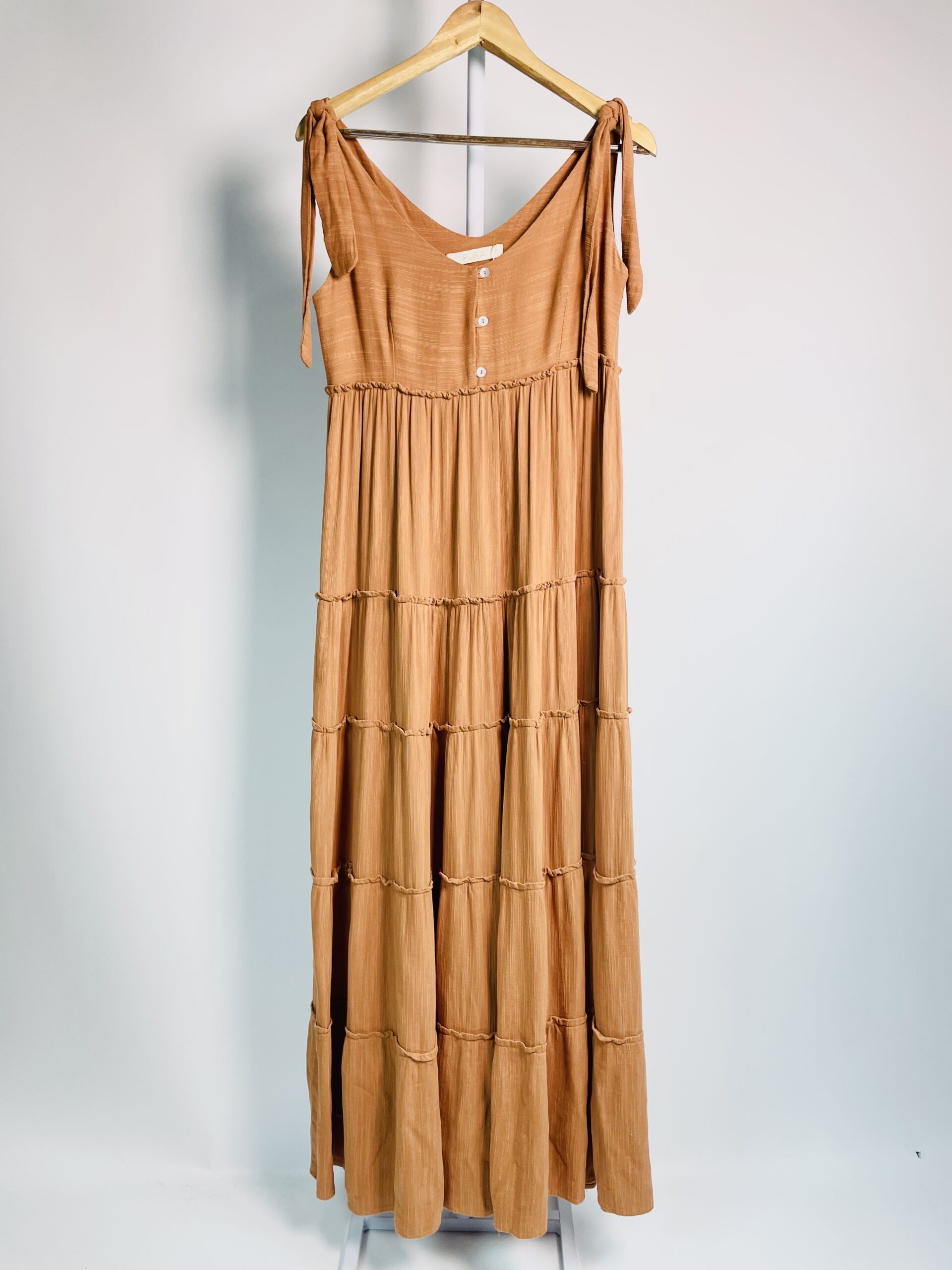 Vestido marrom longo com babados e amarração nas alças PURA – P