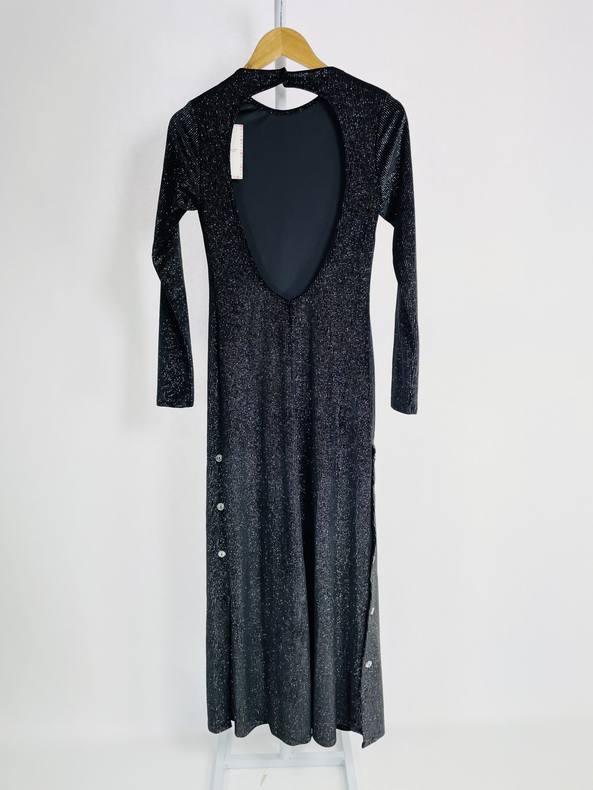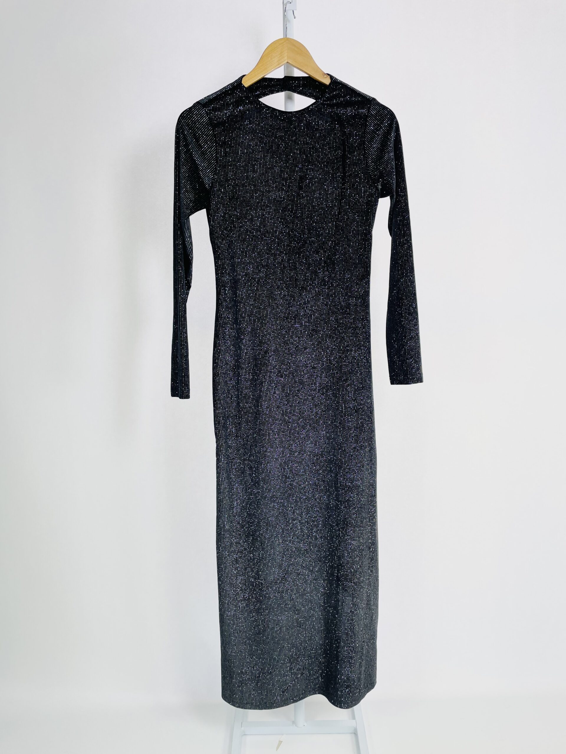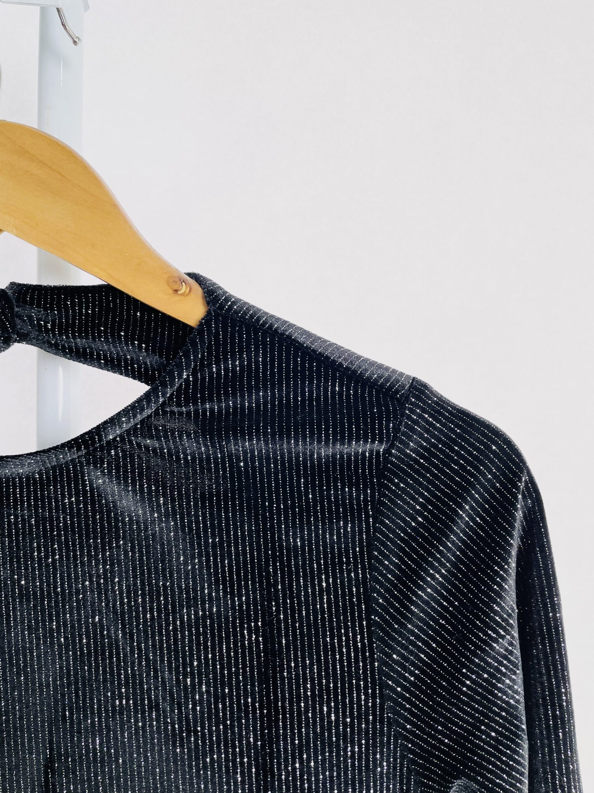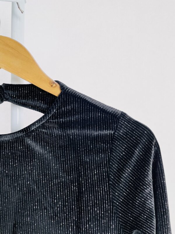 Vestido veludo preto com listras em lurex prata mangas longas e decote nas costas ALLMOST VINTAGE – P *nunca usado*